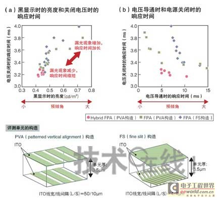 實(shí)際上,僅在單側(cè)賦予1~2度預(yù)傾角的Hybrid FPA試制單元在電壓關(guān)閉時(shí),液晶分子的響應(yīng)時(shí)間為3.2ms,黑顯示時(shí)的亮度為0.42cd/m2,比用此前的FPA技術(shù)試制的單元均有改善(圖2(a))。Hybrid FPA試制單元的液晶層厚度為3.5μm。一般情況下,液晶層越薄,配向膜的效果就越好,液晶分子的響應(yīng)速度也就越快。據(jù)稱(chēng),液晶層僅為3.2μm的試制單元,其響應(yīng)時(shí)間提高到了3ms以下。