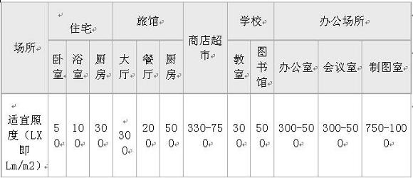 如以下場所的照度水平推薦表