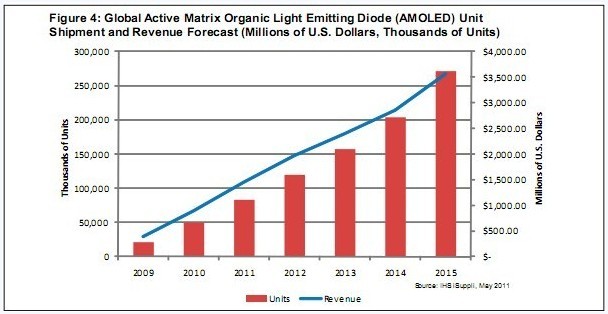 AMOLED正在迅速成為智能手機青睞的顯示器,2010-2015年全球出貨量將擴張近五倍。
