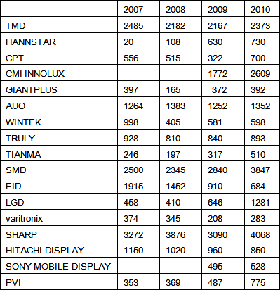 最后,中小顯示屏行業(yè)在一年內(nèi)也經(jīng)歷了比較大的變動。華映(CPT)和彩晶(HANNSTAR)徹底轉(zhuǎn)型為中小顯示屏廠家。CPT在2010年出貨量高達(dá)3.52億片,比2009年增長135%;HANNSTAR在2010年出貨量高達(dá)2.48億片,比2009年增長505%。雖然出貨量大增,但是平均單價不高,毛利低。加上TFT-LCD生產(chǎn)線的高額折舊費(fèi)用,這兩個廠家還處于虧損的泥潭之中。