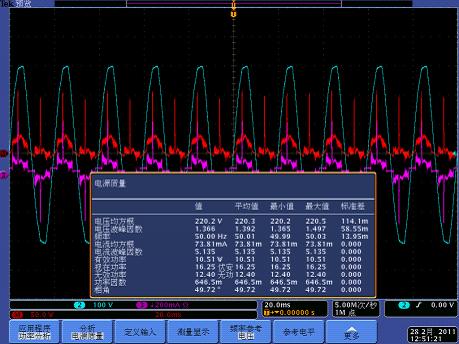 測(cè)量驅(qū)動(dòng)電源的輸入功率、功率因數(shù)和諧波有很多方法,使用具有電源分析功能的泰克示波器產(chǎn)品可以輕松實(shí)現(xiàn)這些電能質(zhì)量測(cè)量。使用一路通道測(cè)量輸入電壓、一路通道測(cè)量輸入電流,配合示波器內(nèi)置的PWR電源分析軟件,所有的電能質(zhì)量相關(guān)參數(shù)可以直接顯示在屏幕中。