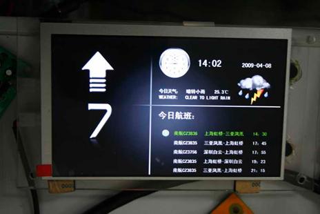 傳統的電梯外呼板采用點陣LED或黑白液晶顯示,顯示效果單調,而采用TFT液晶顯示,不但亮度高,而且可以顯示彩色圖片及文字,顯示效果美觀,此外還可以根據需要顯示一些廣告、通知等信息,是為未來的發展方向。