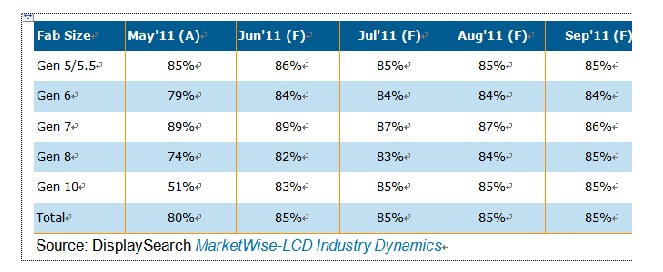 大尺寸TFT LCD面板平均產能利用率在2011年第一季度下降,4月份產能為79%。第二季度市場需求激增,面板商提高產能利用率,6月份將達到85%。面板商原本計劃在第三季度繼續提高產能,但因為實際市場情況而不得不改變生產策略。
