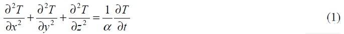 其中:T 為溫度;t 為時(shí)間;x, y, z 空間三維坐標(biāo)系;α 為熱膨脹系數(shù),α 滿(mǎn)足方程: