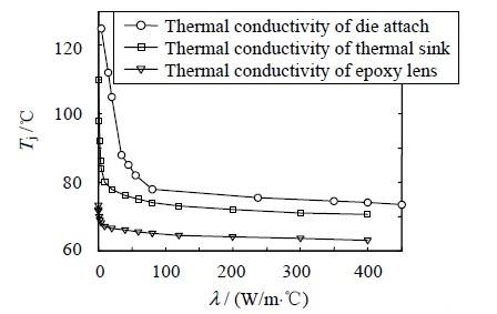 由圖可知,LED 結(jié)溫隨著熱沉和鍵合層導(dǎo)熱系數(shù)的變化趨勢(shì)類(lèi)似,當(dāng)λ 較小時(shí),隨著λ 增大,結(jié)溫迅速降低;當(dāng)λ 較大時(shí),隨著各種材料導(dǎo)熱系數(shù)變化,結(jié)溫變化平緩。這是因?yàn)楫?dāng)λ 較小時(shí),各材料的熱阻較大,而當(dāng)λ 較大時(shí),熱阻減小,熱量能順利傳出,此時(shí)導(dǎo)熱系數(shù)不再是影響整個(gè)系統(tǒng)傳熱效果的主要因素。由于LED 傳熱并不經(jīng)過(guò)透鏡,所以透鏡的導(dǎo)熱系數(shù)對(duì)LED 的結(jié)溫變化影響很小。