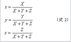 CIE XYZ 1931色度系統中的色坐標x, y, z與三刺激值XYZ之間的關系式如下: