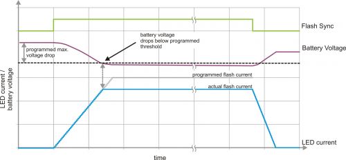 TI 擁有一種監控電池電壓的閃光燈驅動器技術。要獲得穩定的 LED 電流波形并且避免過多的電池壓降,閃光燈驅動器要主動控制 LED 電流上升/下降順序。在上升階段(上升斜率為 25mA/12µs),要對輸入電壓進行監控。如果輸入電壓降至某個設定閾值以下,則器件即刻停止讓 LED 電流進一步上升至該設定閾值,并將閃光燈電流保持在實際電平,參見圖 5。