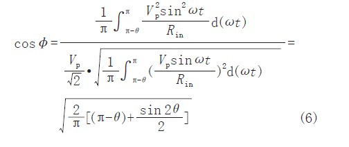 從式(5)可得電路的功率因數如式(6)所示,功率因數隨可控硅的導通角的關系如圖3b)所示。