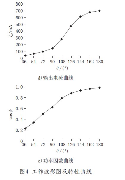 圖4d)為可控硅不同導通角對應的輸出電流曲線,實際調試中可控硅導通角在150°之后就接近滿載輸出了。圖4e)為可控硅在不同導通角下對應電路的cosφ曲線。