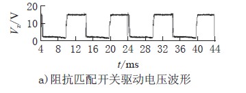 圖4a)、b)、c)為可控硅導通角為115°時阻抗匹配開關驅動電壓VZ、輸入電流Iin、輸入電壓Vin的波形,電路的輸出電流為470mA,功率因數為0.78。從圖中可看出,當可控硅導通瞬間,由于驅動器輸入端有差模濾波電容導致輸入電流有沖擊電流尖峰,而當輸入電流小于一定值時,阻抗匹配開關開通以保證流過可控硅的電流大于其維持電流。
