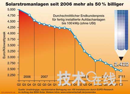 德國太陽能發電行業團體BSW-Solar宣布,屋頂設置型太陽能發電系統2011年第一季度的零售價(包含安裝工程費)降到了2006年的一半以下。