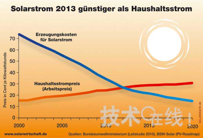 圖2:到2013年,太陽能發電成本將低于家庭電費。圖為德國太陽能發電的發電成本(藍線)與家庭電費(紅線)的比較。