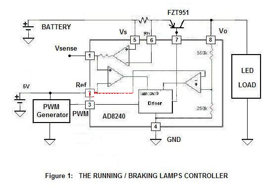 LED的開關取決于CMOS兼容型PWM引腳(AD8240引腳3)上的數字電壓。對于簡單的開關控制,此電壓可以是連續的;對于調光控制,此電壓為PWM。PWM頻率應低于500 Hz,占空比范圍從5%到100%。典型值為5%(行駛時)和95%(剎車時)。圖2中,PWM頻率由R1、R2和定時器A1的C1決定。脈沖周期為: