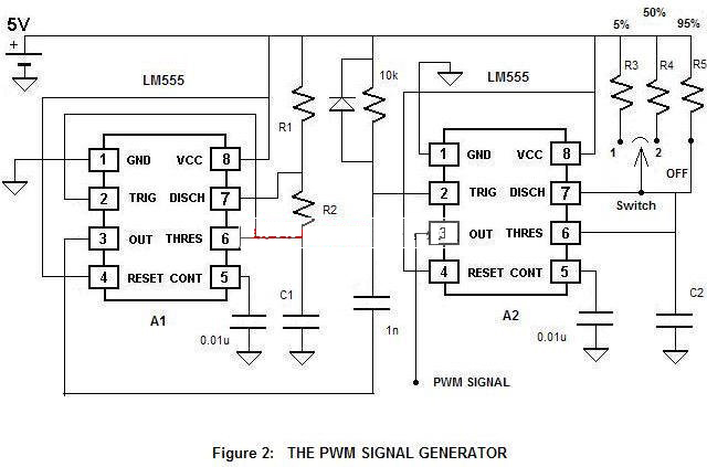 定時器A2將該信號轉換為脈沖寬度調制信號,后者的占空比由R3、R4、R5和C2決定。脈沖寬度由下式決定: