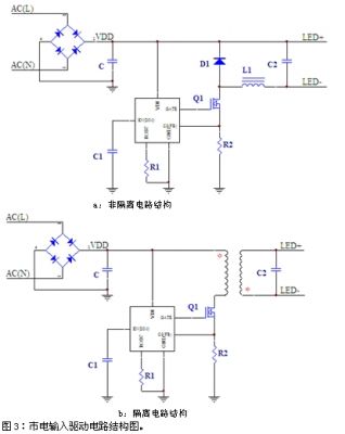 作為一種新型的節能、環保的綠色光源產品,LED擁有廣闊的市場前景。市場現階段已經出現上千款LED驅動IC。其中我們遇到比較多的是單芯片線路結構(圖1a)。