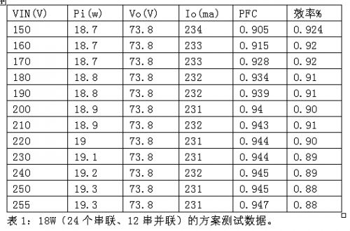 在AX2028_TUBE_18W非隔離應用設計(圖4)中,LED光源陣列設計為0.06W白光LED(SMT或草帽燈)24個串聯、12串并聯的方案,驅動288個小功率WLED,總功率為18W。