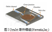 除了熱界面外,主動散熱系統已越來越受企業的歡迎。圖3給出了SynJet主動散熱模塊,它可以產生脈動空氣,從而可以把LED燈內部的熱直接帶到外面。據了解,SynJet技術可以幫助設計師解決一些產品的散熱問題,如電腦產品,特別是高可靠性的LED產品。該技術有高散熱效率、低噪音、高可靠性和低功耗等優點。