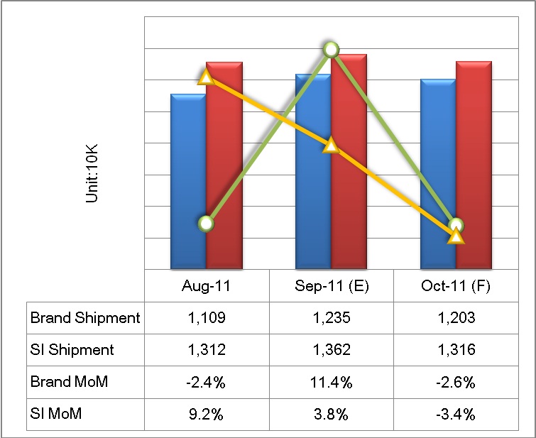 根據集邦科技(TrendForce)旗下研究部門WitsView全球前十大液晶監視器出貨調查顯示,前十大品牌廠商2011年8月在美系廠商因季初而導致出貨動能疲軟,加上終端消費市場需求依然平淡下影響下,MoM下滑至2.4%,為1,109萬臺。一如WitsView預期,8月份SI陸續接獲第四季品牌短單及部分SI出貨從谷底攀升下,呈現較高幅度之月成長,達9.2%。展望SI第四季出貨,WitsView表示由于2012中國農歷年在一月下旬較往年為早,為因應中國新年假期而引起的缺工問題,部分第一季需求將提前在第四季反應,QoQ出貨將呈現小幅成長。展望品牌九月出貨,除了季底需沖刺出貨量及部分區域的教育市場訂單釋出外,品牌廠商亦摩拳擦掌為中國十一長假銷售準備,因此WitsView預估九月將有9-12%出貨成長空間。