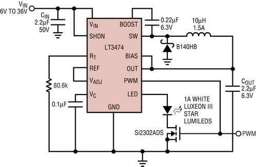 LED亮度可由圖1中的LT3474來控制,把一個(gè)模擬電壓輸入連接至VADJ引腳或把一個(gè)數(shù)字PWM信號輸送至PWM調(diào)光MOSFET的柵極和PWM引腳。簡單的模擬亮度控制通過降低內(nèi)部檢測電阻上的電壓,將恒定LED電流從1A降至更低的值,但是LED光線的顏色在低電流時(shí)會變化。調(diào)光比的實(shí)際限制大約為10:1。
