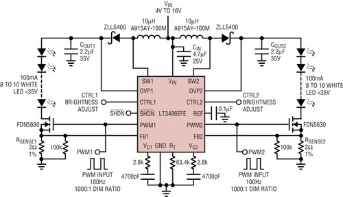 圖2是LT3486雙輸出升壓型LED驅(qū)動器的應(yīng)用,它以100mA恒定電流驅(qū)動兩串LED,LED電壓高達(dá)36V。