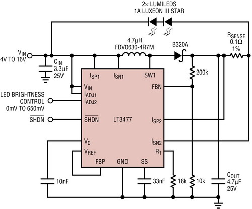 圖3所示的LT3477降壓-升壓型LED驅(qū)動器以1A電流驅(qū)動兩個(gè)大功率LED。這兩個(gè)LED無需以地為基準(zhǔn),連接的兩個(gè)端子一般是轉(zhuǎn)換器的輸出和電池輸入。LT3477有兩個(gè)獨(dú)特和具100mV浮動電流檢測輸入引腳,這引腳連接與LED串串聯(lián)而且不以地為基準(zhǔn)的電流檢測電阻。在汽車電池的工作電壓范圍內(nèi)以及低于這個(gè)范圍時(shí),在電流直到1A的情況下都可實(shí)現(xiàn)準(zhǔn)確的LED穩(wěn)流。LT3477的停機(jī)引腳用于實(shí)現(xiàn)車燈的接通/斷開功能,并在未使用時(shí)將輸入電流降低到1uA(典型值為100nA)。IADJ引腳用來為后部信號指示燈或剎車燈等剎車燈和尾燈應(yīng)用實(shí)現(xiàn)高于10:1的模擬調(diào)光比。這類應(yīng)用無需真彩PWM調(diào)光。