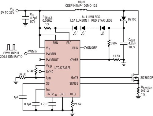 如圖4所示,大功率LED驅(qū)動器LTC3783采用降壓-升壓型拓?fù)洌?qū)動6至10個(gè)3W紅光LED,用于汽車尾燈應(yīng)用。外部開關(guān)MOSFET和開關(guān)電流檢測電阻為大功率和高壓LED驅(qū)動器設(shè)計(jì)提供了最大的設(shè)計(jì)靈活性。如果電池電壓降至低于9V,那么9V至36V輸入和在電流為1.5A時(shí)高達(dá)25V的LED串輸出需要100V的額定開關(guān)電壓和高于8A的峰值開關(guān)電流能力。在整個(gè)汽車電池電壓范圍內(nèi),1.5A恒定電池電流是良好穩(wěn)定的。就剎車燈和尾燈調(diào)光而言,在100Hz時(shí),可以用直接連接到LTC3783PWM引腳的PWM信號降低LED電流,以實(shí)現(xiàn)高達(dá)200:1的調(diào)光比。在1kHz時(shí),調(diào)光比降低至?20:1,這對尾燈應(yīng)用來說已足夠了。調(diào)節(jié)ILIM引腳也可以降低LED電流。