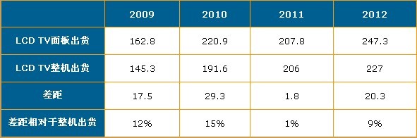 - 2010年電視面板出貨與整機出貨差距達到了15%