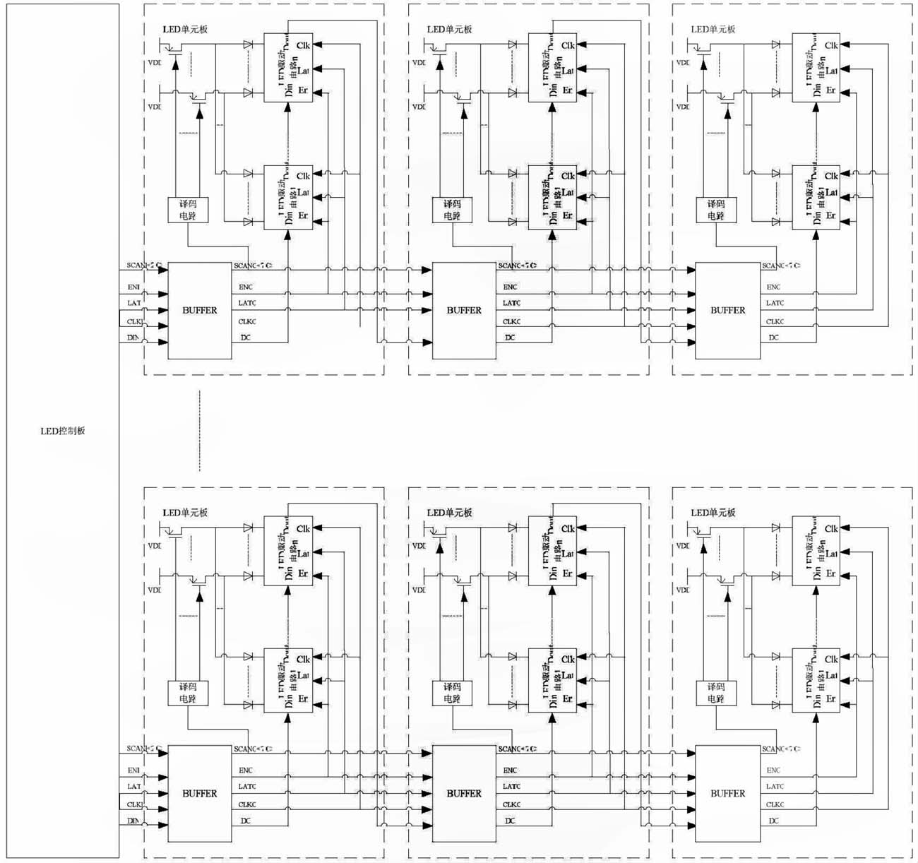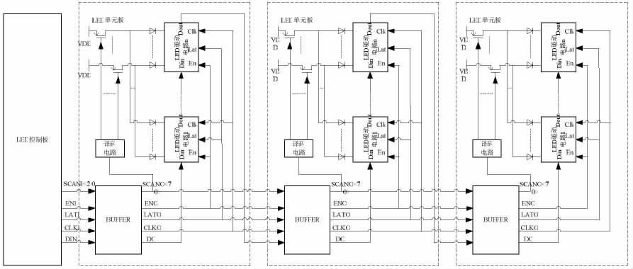 LED 控制板與LED 單元板構(gòu)成的LED 顯示系統(tǒng)的主體,如圖1 所示。其中,LED 單元板包括了增強(qiáng)信號驅(qū)動能力的BUFFER 電路、產(chǎn)生動態(tài)顯示掃描時序的譯碼電路、若干個開關(guān)管和若干個LED 驅(qū)動電路。其通信過程為:LED 控制板發(fā)出的通信信號依次經(jīng)過各串接的LED 單元板的BUFFER 電路進(jìn)行驅(qū)動增強(qiáng);各LED 單元板中經(jīng)BUFFER 電路增強(qiáng)后的掃描信號(SCANO)提供給本LED 單元板的譯碼電路,譯碼電路譯碼產(chǎn)生動態(tài)顯示掃描時序控制開關(guān)管;各LED 單元板中經(jīng)BUFFER 電路增強(qiáng)后的使能信號(ENO)、鎖存信號(LATO)、時鐘信號(CLKO)分別提供給本LED 單元板中所有LED 驅(qū)動電路。