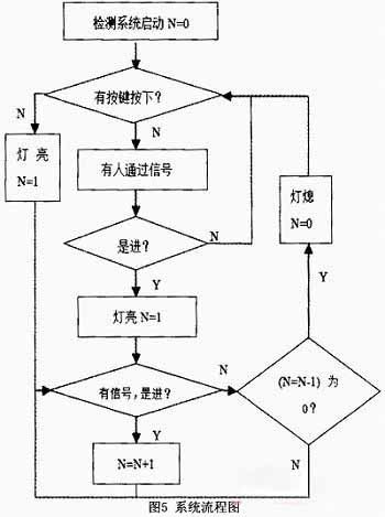 系統流程圖如圖5所示。其中N表示洗手間內現有的人數,當檢測系統電源連上后,光電傳感器開始檢測,但系統不知道洗手間內此時是否有人,默認是無人,因而燈是不會亮的,這時按鍵可以用來對系統進行調整。當光強增大到一定值時,檢測系統自動停止工作。