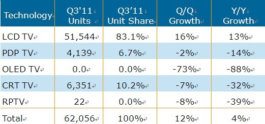 表一、Q3’11全球電視按技術別出貨量和市占率(單位:千臺)