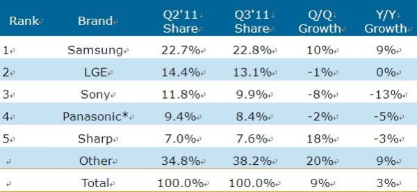 表二、Q3’11全球前五大平板電視品牌商營收占比