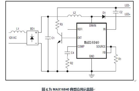 而MAX16840芯片有3個重要引腳功能:FB引腳電壓可檢測輸入電流,并調節其平均值;而輸入引腳(REFI)用于設置輸入電流值,引腳電壓低于特定門限時,輸入電流與該電壓成正比,電壓超過特定門限時,輸入電流將置于固定的預置水平。據此利用REFI的非線性特性,連接一個NTC電阻,即可得到熱折返保護;IN引腳具有內部過壓保護,避免內部開關MOSFET在LED串開路或LED串電壓過高時損壞;它帶有一個獨立的EXT引腳,確保低輸入電壓開啟時提供一個觸發啟動電流,以配合電子變壓器正常工作。EXT驅動外部npn晶體管,一旦IN跌落到5.5V UVLO門限以下,將EXT拉至地電平,外部npn晶體管關斷。其IC采用3mm x 3mm、10引腳、TDFN封裝,-40°C至+125°C工作溫度范圍。圖4為MAX16840典型應用示意圖。它被廣泛應用于MR16及其它12V交流或直流輸入LED照明之中。