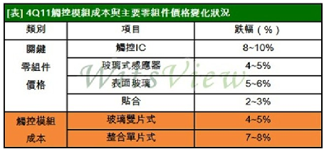 2011年第四季觸控模組成本與主要零組件價格變化狀況