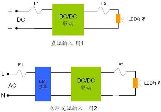面對LED照明的眾多應用領域,由于市場并沒有形成統(tǒng)一的規(guī)范,存在多種多樣的驅動解決方案,但是萬變不離其中,從過流保護的角度來看大體上根據燈體的輸入電流來可以分為:直流輸入和電網交流輸入兩種最基本的類型,兩種類型的主要區(qū)別在于驅動電源是否有交流轉直流的模塊。當然市場上也有很多電阻、阻容降壓等低成本解決方案,沒有EMI整流和恒流驅動的模塊,但是由于初級端保險絲的選用要求與圖2是一致,在此歸入第二種類型。