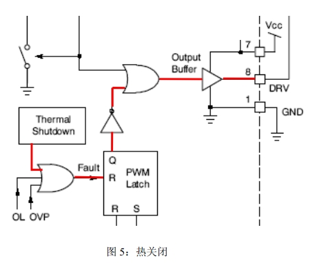 熱關(guān)閉(TSD):過熱保護(hù)功能有助于實現(xiàn)良好的電源設(shè)計。當(dāng)結(jié)點溫度超過140℃時,該功能激活,驅(qū)動器變?yōu)榈碗娖剑唤Y(jié)點溫度降到典型值30℃時器件恢復(fù)工作。