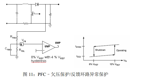 5.欠壓保護(hù)(UVP)/反饋環(huán)路異常保護(hù):UVP可以防止在反饋故障條件下啟動。當(dāng)VFB<8%VPREF=0.2V時,UVP激活,器件關(guān)閉;當(dāng)VFB高于12%VPREF=0.3V時,器件自動開始工作。