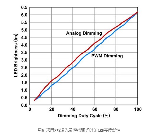 此外,驅(qū)動(dòng)器可達(dá)到較高的光電轉(zhuǎn)換效率,這表示耗用相同的電力可達(dá)到更高的流明。然而,模擬調(diào)光也有深度調(diào)光的某些電流準(zhǔn)確度問題,此因回饋調(diào)節(jié)電壓或電流汲入電壓過小,而無法準(zhǔn)確控制,此乃受限于錯(cuò)誤放大器的偏移電壓所致。亮度線性及色度也不比PWM調(diào)光,尤其是在深度調(diào)光時(shí)(圖5)。事實(shí)上,除非將兩個(gè)相同的顯示器并置進(jìn)行比較,否則一般人很難辨別色度或線性的差異。