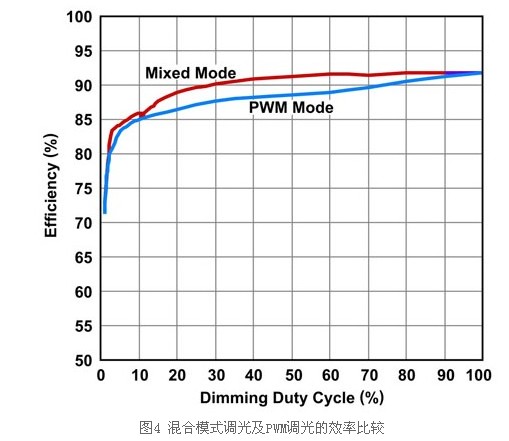 由于升壓轉(zhuǎn)換器須要提供較低的輸出電壓,因此輸入電源需求會(huì)降低并使效率提高(圖4)。在混合模式調(diào)光中,驅(qū)動(dòng)器執(zhí)行D最低達(dá)到6.25%的模擬調(diào)光,接著轉(zhuǎn)換為PWM調(diào)光,以提高亮度線性。