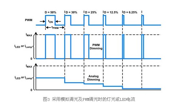 為提升顯示效果,并優(yōu)化不同環(huán)境照明亮度的LED驅(qū)動(dòng)器效率,較新型LED背光電子裝置能達(dá)到較大的調(diào)光范圍。有兩種方法可用于LED調(diào)光:脈沖寬度調(diào)變(PWM)調(diào)光及模擬調(diào)光(圖3)。