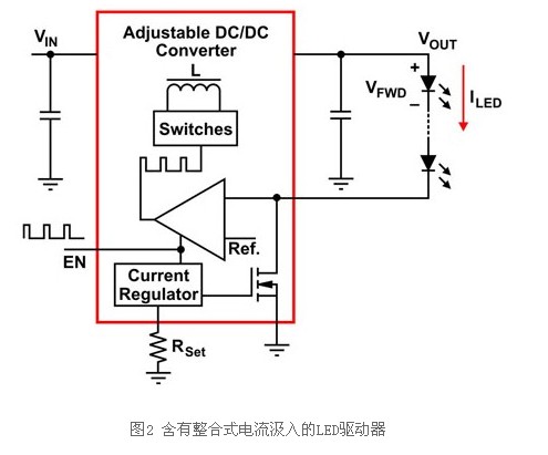 某些具有電流汲入的驅(qū)動(dòng)器將輸入PWM訊號(hào)濾波,然后以經(jīng)過位準(zhǔn)偏移的訊號(hào)來驅(qū)動(dòng)電流汲入,如TPS6116x系列之類的其他驅(qū)動(dòng)器則使用輸入PWM訊號(hào),將負(fù)載周期用于能隙參考電壓,因此VREF=D×VREF(MAX)。由于ILED DC電流變化緩慢,因此輸出電容電壓不會(huì)有漣波。所以電容不會(huì)出現(xiàn)像采用PWM調(diào)光時(shí)所產(chǎn)生的振動(dòng)。