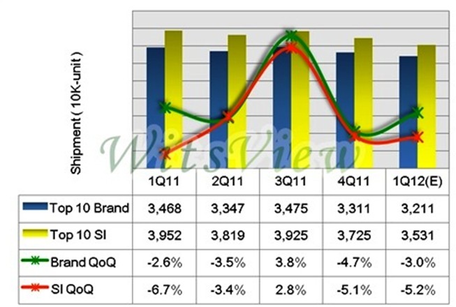WitsView表示,衰退主因?yàn)?2011年第四季部分需求提前于第三季底反應(yīng),而終端銷售受到歐洲債信風(fēng)暴持續(xù)發(fā)酵,以及全球經(jīng)濟(jì)動(dòng)能復(fù)蘇遲緩的影響,通路拉貨力道無法延續(xù);其次,面板價(jià)格雖于第四季止跌,但在終端需求疲軟下,反彈動(dòng)能受到壓抑,使得品牌及通路商無提前備貨需要;再者,部份2012中國春節(jié)需求提前至2011第四季反應(yīng),但多數(shù)代工及品牌廠考量年底的庫存盤點(diǎn)壓力,而必須進(jìn)行庫存水位與出貨的調(diào)整。