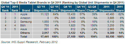 2011年全年,蘋果iPad出貨量為4050萬臺,比2010年增長168%,不過市場份額從2010年的87%下降到62%。三星全球年出貨量為611萬臺,市場份額為9%。亞馬遜Kindle Fire只在第四季度上市,因此全年市場份額只有6%。邦諾的Nook和華碩分列第四和第五,市場份額分別為5%和3%。