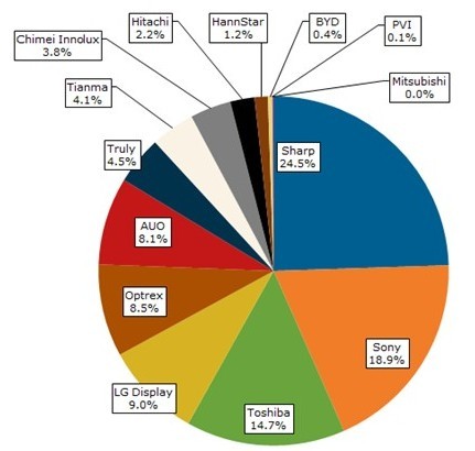 夏普、索尼、東芝等日本液晶顯示器制造商都專注于發(fā)展車用液晶顯示屏,不僅因?yàn)檫@些公司有能力產(chǎn)出高質(zhì)量的中小尺寸面板,也可以取得較高獲利空間。在車載應(yīng)用上,夏普為領(lǐng)先廠商,擁有24.5%的市占率;索尼居次,為18.9%;東芝則有14.7%的市占率。