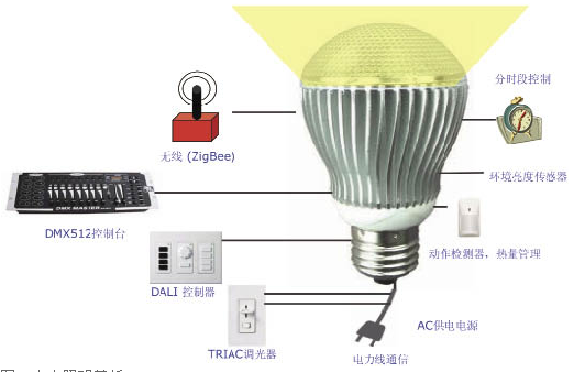 未來照明革新市場潛力巨大,如圖1所示。分時段控制是指在不同時間段有不同的亮度。環境亮度傳感器可以靈活應對燈具所處環境的亮度,比如天陰的時候天黑的比平常早,那么路燈就會提前打開。動作傳感檢測器是指夜晚的時候如果燈具周圍無人活動時,會調低亮度,當檢測到有人活動時,就會調高亮度。另外,現代照明需要有多重通信方式,除了無線方式以外,DALI或DMX512等先進的照明專用通信協議使得燈具的管理更加便捷,電力線載波通信(PLC)也是近年來備受關注的方向。