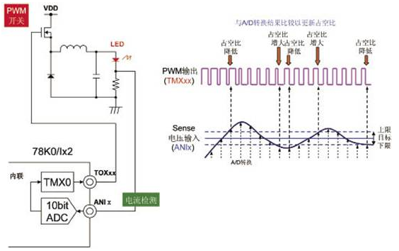 第二種是通過A/D轉換器進行反饋控制,使用A/D轉換器檢測LED電流,通過改變PWM輸出占空比實現恒流控制。通過改變A/D轉換的目標值實現各通道的獨立調光,如圖3所示。