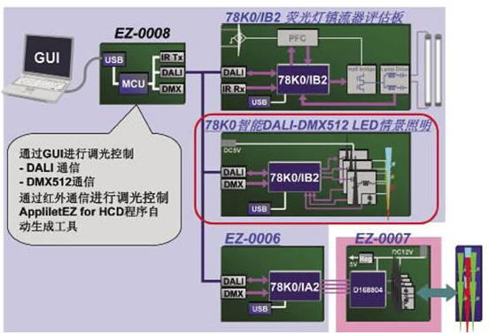 瑞薩電子的照明參考方案由3部分組成,可通過PC端GUI進行調光控制,PC和通信板通過USB線連接,情景照明板和通信板之間可以由紅外、DALI及DMX512三種方式實現,在瑞薩電子的照明參考方案中,可以使用AppliletEZ for HCD程序自動生成工具,實現照明控制程序的涉及、編譯和燒寫。照明參考方案如圖5所示。