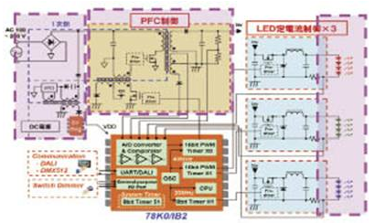 基于78K0/IB2 LED路燈方案如圖8所示。可實現AC220V,具有 PFC;驅動總功率60W;調光通信接口可采用RS485/PLC接口。