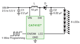 在電感升壓型拓撲結構方面,安森美半導體提供采用PWM和/或單線式調光方式的不同產品,適合在低電壓便攜式設備背光和閃光應用中驅動白光LED。這些產品包括:輸出電流為20 mA的CAT37、CAT32、CAT4238、CAT4252、CAT4253、CAT4157、CAT4158和CAT4258,輸出電流為40 mA的CAT4137和NCP5005,輸出電流為50 mA的CAT4139,以及更大輸出電流的CAT4240(250 mA)、NCP1422(800 mA)和CAT4131(1.5 A/0.3 A)等。