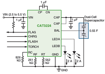 電荷泵型驅動器CAT3224也適合相機閃光應用,從而支持高百萬像素相機閃光,以及替代氙氣閃光,配合纖薄設計。CAT3224是業界首款4 A單芯片超級電容LED驅動器,集成了雙模1x/2x電荷泵,提供三項關鍵功能:精密的超級電容充電控制、電流放電至LED閃光的管理,以及為LED手電筒模式提供恒流。這三種模式的工作電流均可以3個外部電阻來簡易編程,提供達4 A的LED閃光脈沖電流。超級電容技術的高峰值電流優勢,結合CAT3224簡單的并行邏輯接口,使該器件非常適用于采用LED替代氙氣燈的應用。