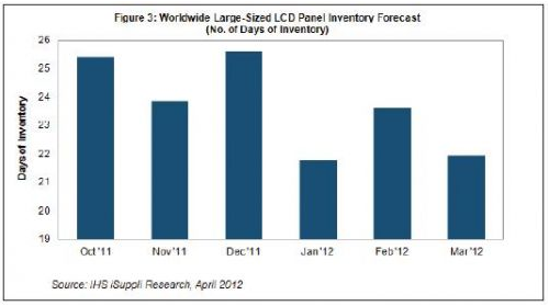• 大尺寸LCD面板的庫存從2月時的23.6天降到22.0天
